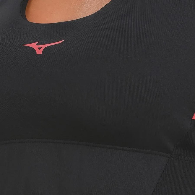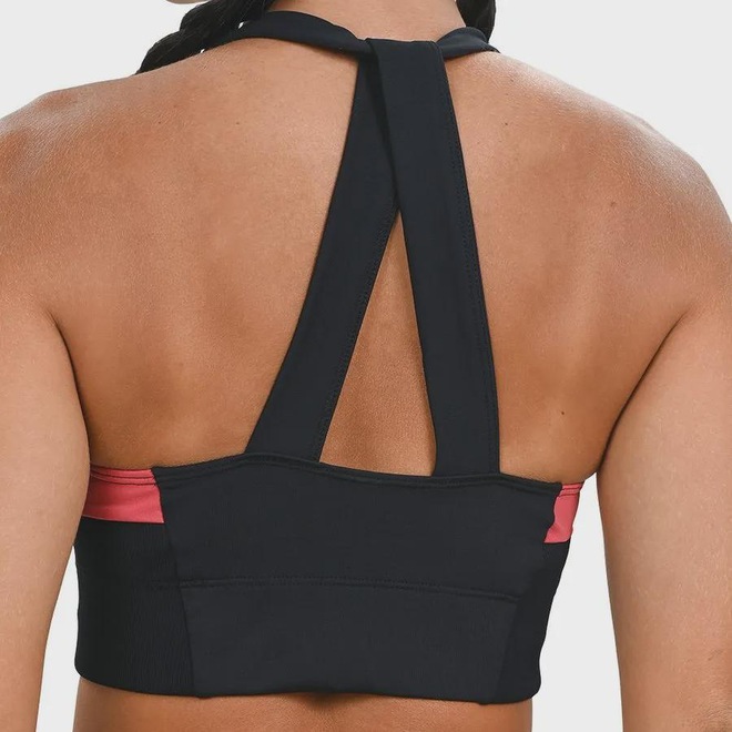 Top feito com 2 tipos de tecido liso e canelado de média compressão. As alças largas nas costas proporcionam maior sustentação e contém bojo removível. Os recortes são contrastantes. Logo não refletivo.