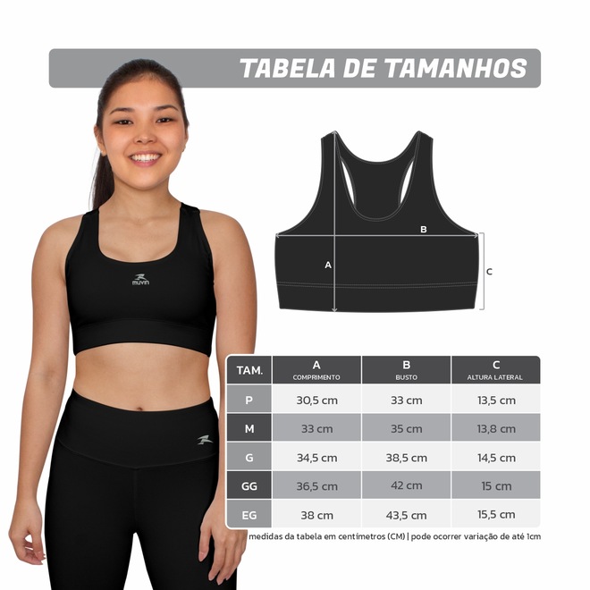 ALTO DESEMPENHO: Por conta das alças em formato nadador, o Top Basic Muvin contribui para uma melhor sustentação dos seios, com boa elasticidade e sem apertar em excesso, além de oferecer mais conforto à coluna