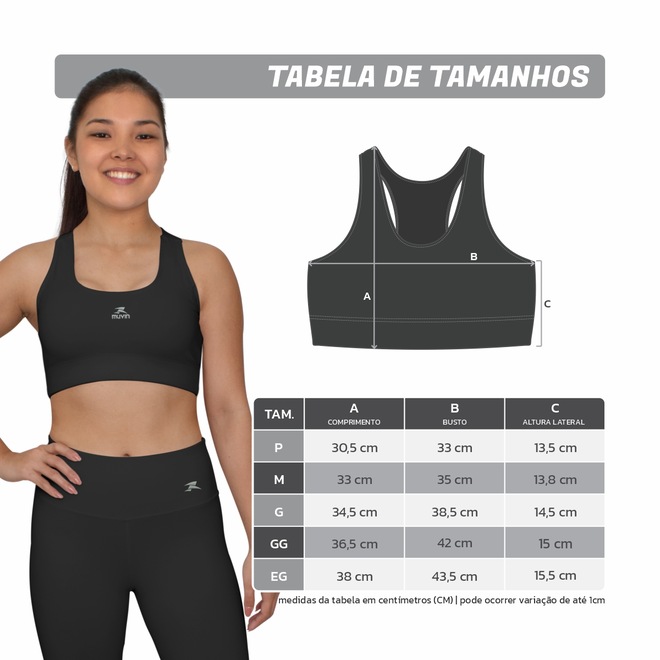 Também possui boa respirabililidade e toque suave, que evita assaduras e não machuca a pele. Com uma modelagem simples, porém bastante eficiente, o top não possui recortes e costuras em demasia, evitando assim atrito desnecessário com a pele. A peça também é produziada com costuras reforçadas e ótimo acabamento, garantindo maior durabilidade, resistindo a diversas lavagem.