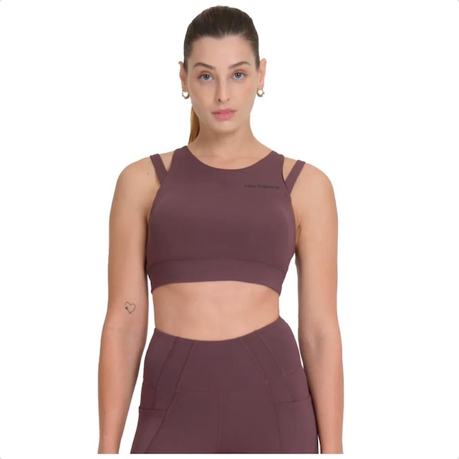 O Top Feminino New Balance Achiever apresenta as tecnologias Shape Shield e NB DRYx de absorção de umidade.
