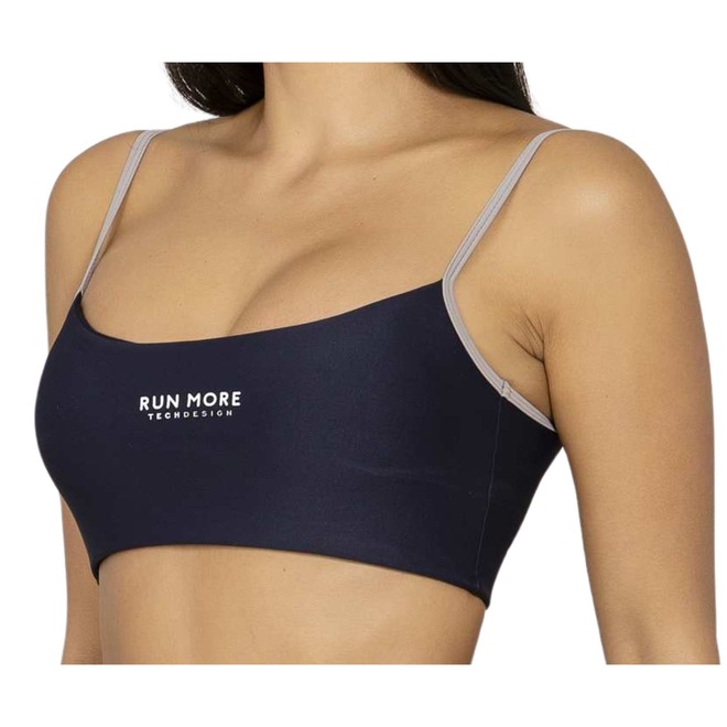 Top para atividades físicas com suporte moderado, destacando-se pelo design nas costas e textura 3D que remete ao tecido telado digital. Alças finas e detalhes em cores contrastantes conferem um visual sofisticado. Com bojo removível e o símbolo Run More Tech Design na parte frontal, este top é a união perfeita entre design inovador e a identidade da coleção. Essencial para quem valoriza funcionalidade e estilo.