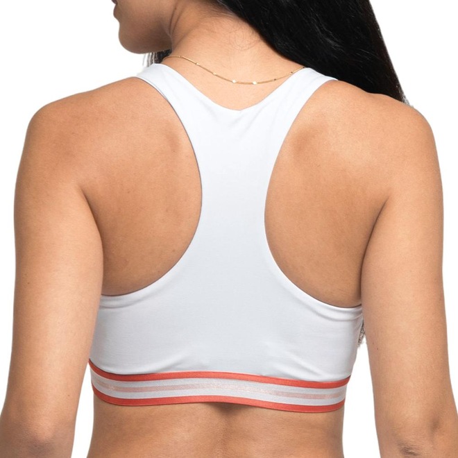 - Detalhamento: Decote redondo, alças largas com costas estilo nadador, tecido duplo que garante maior sustentação e elástico em cor contrastante. Escrita da marca em alto relevo no lado esquerdo, próxima à barra;
