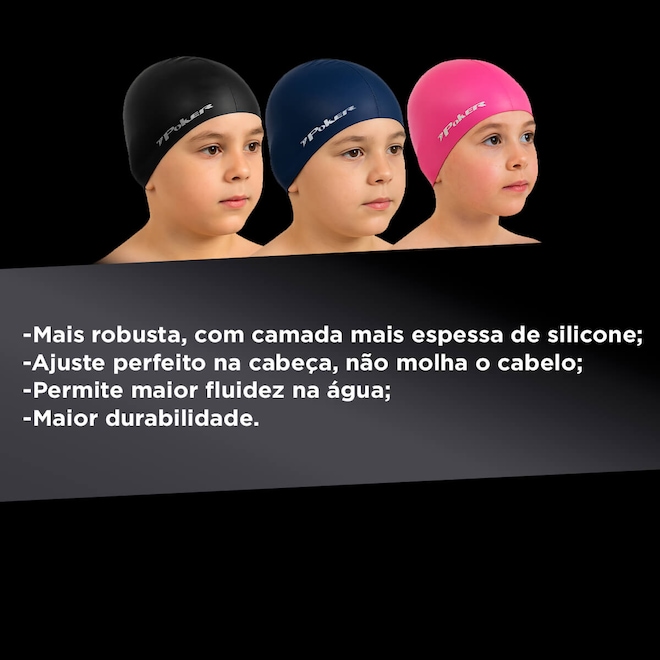 A touca de natação Poker Power é feita com 100% de silicone, proporcionando uma superfície interna texturizada e maior elasticidade, garantindo assim um ajuste perfeito à cabeça. Veste a partir de 6 anos.
