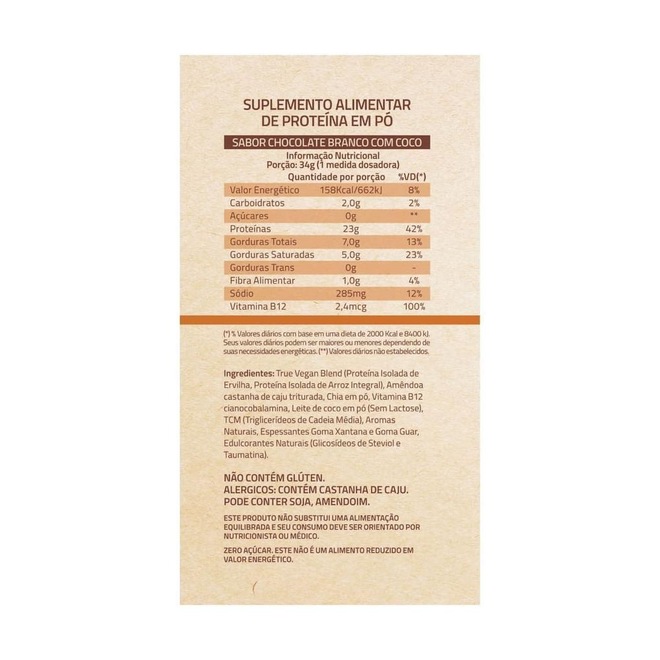 True Vegan Blend (Proteína Isolada de Ervilha, Proteína Isolada de Arroz Integral), Amêndoa de Castanha de Caju Triturada, Chia em Pó, Vitamina B12 (Cianocobalamina), Leite de Coco em Pó, TCM (Triglicerídeos de Cadeia Média), Aromas naturais, Espessantes Goma Xantana e Goma Guar, Edulcorantes Naturais (Glicosídeos de Steviol e Taumatina).