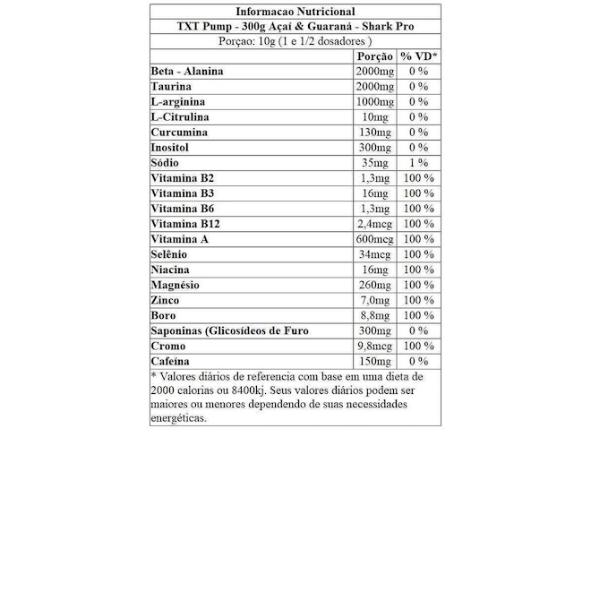 Beta-alanina, taurina, L-arginina, inositol, cafeína anidra, citrato de algas (Chondrus crispus), extrato de semente de feno-grego (Trigonella foenum-graecum L.), niacinamida e sequestrante ácido málico, extrato de rizomas de cúrcuma longa (Curcuma longa L.), pré-mistura de vitaminas e minerais, picolinato de cromo, acidulante ácido cítrico, aroma idêntico ao natural de açaí e guaraná, edulcorante sucralose, ciclamato de sódio, acessulfame de potássio e sacarina sódica, antiumectante dióxido de silício, corantes artificiais vermelho 40, vermelho bordeaux e azul brilhante. ALÉRGICOS: NÃO CONTÉM LACTOSE. NÃO CONTÉM GLÚTEN. ...ref: M18EE8