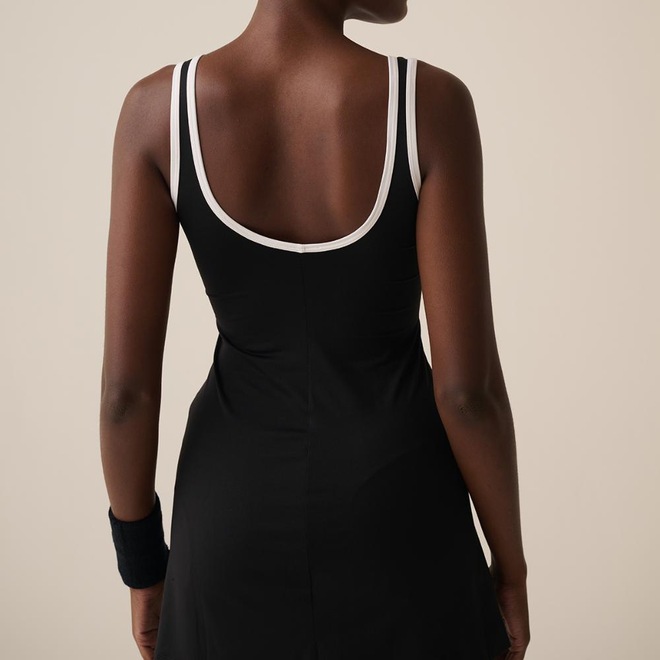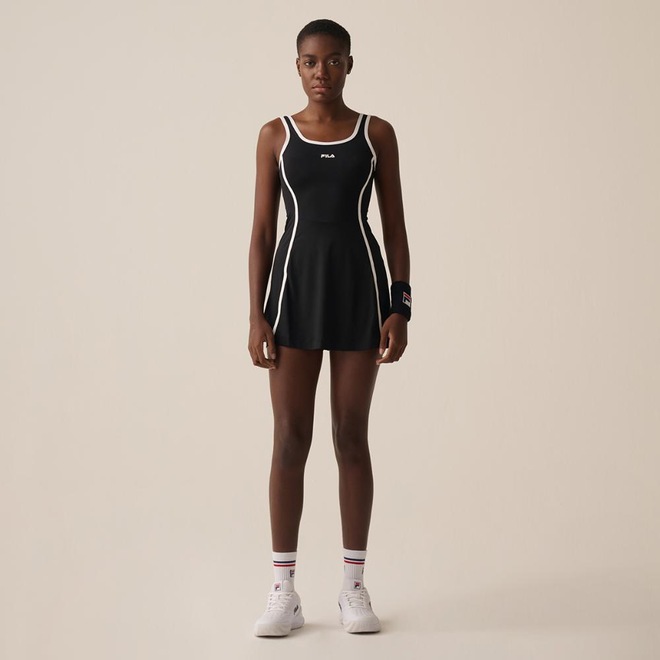 Vestido feminino na modelagem slim, confeccionado em poliamida e elastano. Oferece tecnologia FLOW para respirabilidade, UV PROTECTION FPS 50+, gola e cava com debrum contrastante, decote maior nas costas e recorte em V na cintura. A barra com acabamento de duas agulhas e o FILA Linear estampado no peito completam o design esportivo e sofisticado.