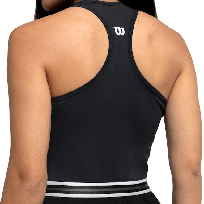 - Detalhamento: Recorte regata, gola arredondada, logo Wilson emborrachado na altura do busto do lado esquerdo. A faixa elástica na cintura, com listras brancas contrastantes, valoriza a silhueta e reforça o visual inspirado nos uniformes clássicos do tênis. A saia plissada completa o design, unindo tradição e modernidade em uma peça perfeita para as quadras;