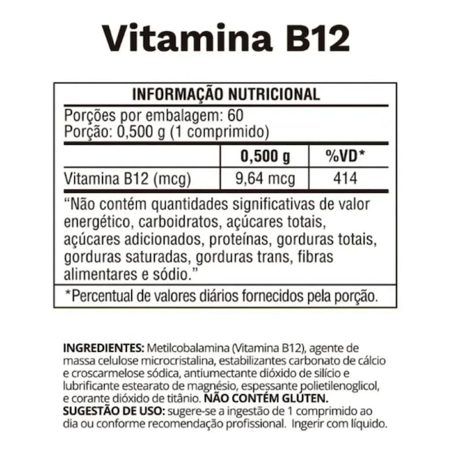 Meticobalamina (Vitamina B12), agente de massa celulose microcristalina, estabilizantes carbonato de cálcio e croscarmelose sódica, antiumectante dióxido de silicio e lubrificante estearato de magnésio, espessante polietilenoglicol e corante dióxido de titanio.