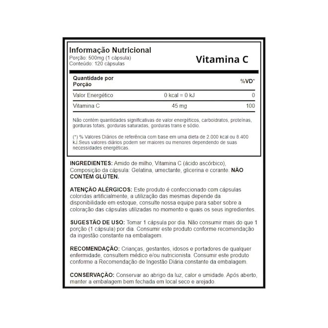 Ingredientes: Amido de milho, Vitamina C (ácido ascórbico), Composição da cápsula: Gelatina, umectante, glicerina e corante. NÃO CONTÉM GLÚTEN.