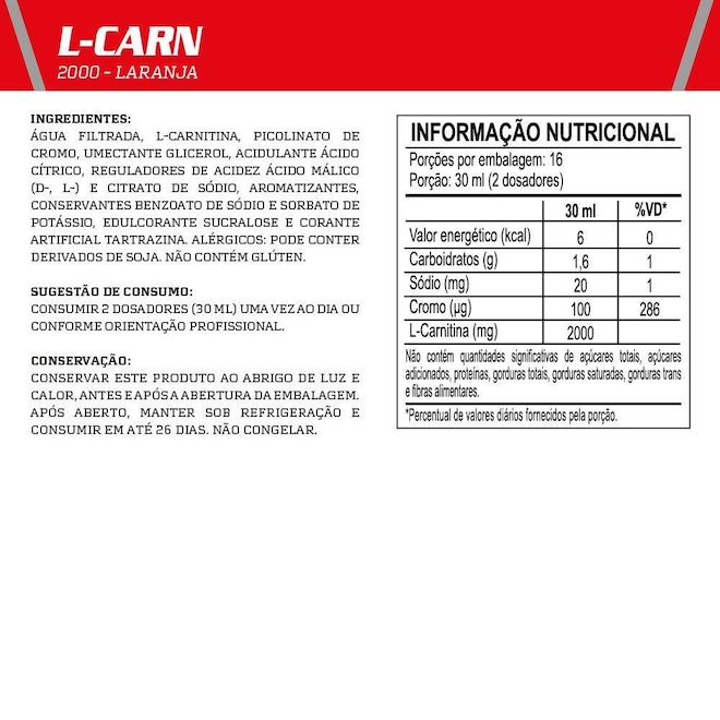 L-carn 2000 é um suplemento a base de L-carnitina na forma líquida, que participa da geração de energia utilizando gorduras como fonte de energia, aumentando a disponibilidade energética do corpo. É usada para melhor performance em exercícios, pois potencializa o metabolismo dos carboidratos e diminui o acúmulo de lactato, que está relacionado ao aumento da fadiga muscular, proporcionando um melhor rendimento esportivo. A L-carnitina reduz danos musculares após exercícios de alta intensidade e curta duração, através do aumento da oxigenação tecidual, melhorando a recuperação muscular, além de auxiliar no retardo do envelhecimento das células cerebrais, atuando nas funções cognitivas promovendo concentração, memória e redução da fadiga mental. L-Carn 2000 é adicionado de cromo, isento de açúcar e gorduras e está disponível em três sabores: laranja, limão e uva.