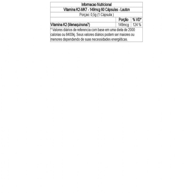 A vitamina K2 MK7 (menaquinona) é recomendada o consumo de 1 comprimido por dia, sendo ingerido com água, a qualquer hora do dia ou conforme as orientações do profissional de saúde. Além disso, pode ser consumido junto com com outros suplementos da linha Lauton, como a vitamina D3, sem maiores implicações.