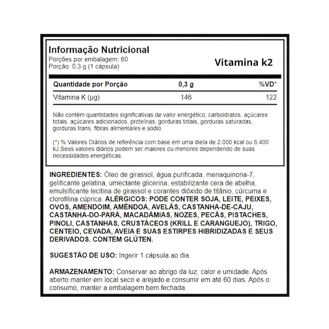Ingredientes: Óleo de girassol, água purificada, menaquinona-7, gelificante gelatina, umectante glicerina, estabilizante cera de abelha, emulsificante lecitina de girassol e corantes dióxido de titânio, cúrcuma e clorofilina cúprica. ALÉRGICOS: PODE CONTER SOJA, LEITE, PEIXES, OVOS, AMENDOIM, AMÊNDOA, AVELÃS, CASTANHA-DE-CAJU, CASTANHA-DO-PARÁ, MACADÂMIAS, NOZES, PECÃS, PISTACHES, PINOLI, CASTANHAS, CRUSTÁCEOS (KRILL E CARANGUEJO), TRIGO, CENTEIO, CEVADA, AVEIA E SUAS ESTIRPES HIBRIDIZADAS E SEUS DERIVADOS. CONTÉM GLÚTEN.