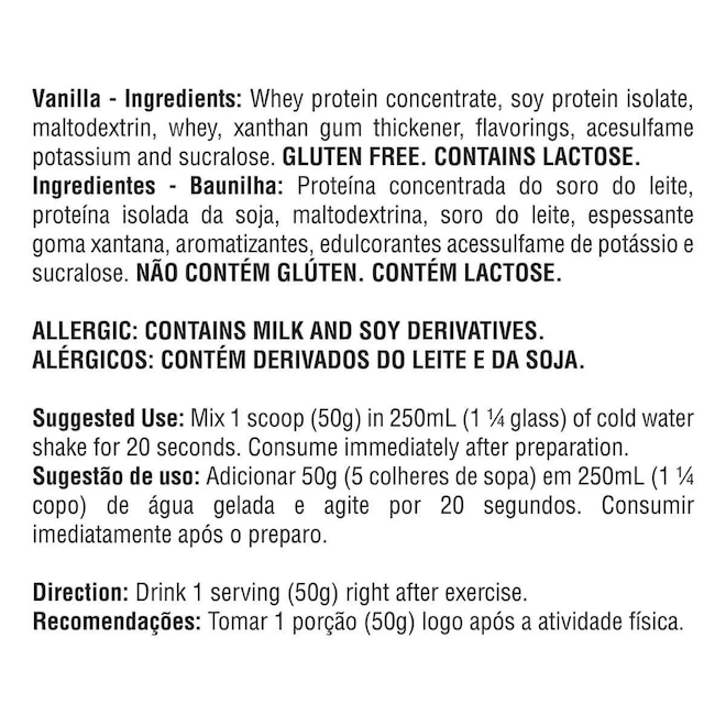 Ingredientes: Proteína concentrada do soro do leite, proteína isolada da soja, maltodextrina, soro do leite, espessante goma xantana, aromatizantes, edulcorantes sucralose e corantes.