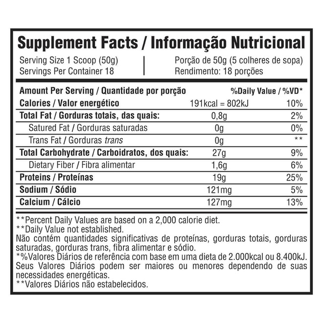 Ingredientes: Proteína concentrada do soro do leite, proteína isolada da soja, maltodextrina, soro do leite, espessante goma xantana, aromatizantes, edulcorantes sucralose e corantes.
