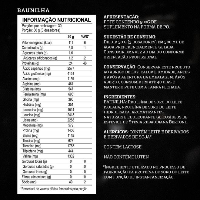 ISO HYDRO CLEAN possui dois tipos de proteínas em sua formulação, whey protein isolado e whey protein hidrolisado sem adição de corantes, adoçantes ou aromatizantes artificiais, resultando em uma proteína pura, rica em aminoácidos essenciais, de rápida absorção e fácil digestibilidade.