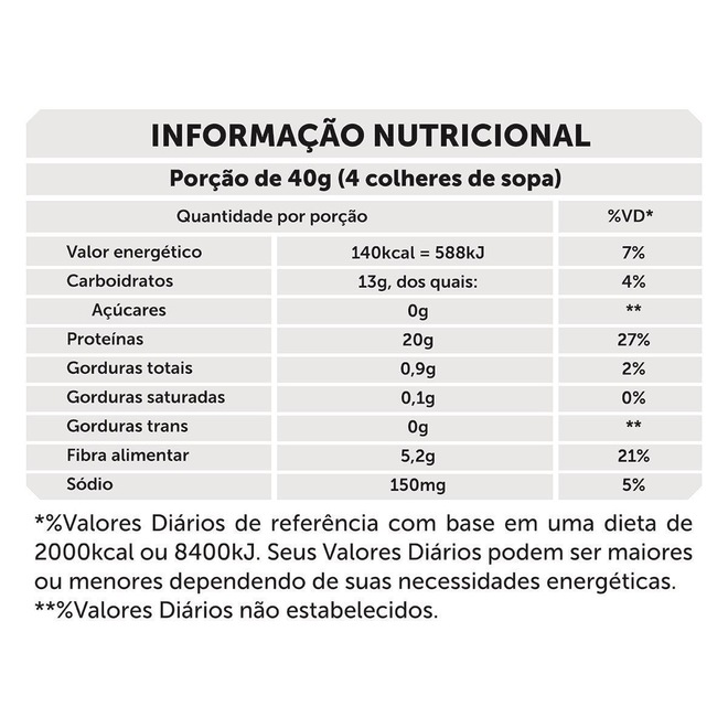 Ingredientes: Proteína isolada da soja, amido de milho ceroso (Waxy Maize), proteína concentrada do soro do leite (WPC), albumina, proteína hidrolisada do trigo (PHW), proteína isolada do soro do leite (WPI), sacarose, proteína hidrolisada do soro do leite (WPH), proteína hidrolisada da carne, aromatizante artificial, espessante goma xantana, antiumectante, edulcorantes sucralose e acessulfame de potássio..