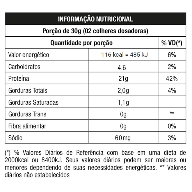 Tipo de Suplemento Proteína Sabor Chocolate Contém Glúten Não Contém Lactose Sim Sugestão de Consumo Pós-Treino Validade Vide Rótulo SAC do Fornecedor INTEGRALMÉDICA: (11) 3003-7887 ou sac@integralmedica.com.br Indicado Ganho de Força Cuidados de Conservação Manter o produto bem fechado.