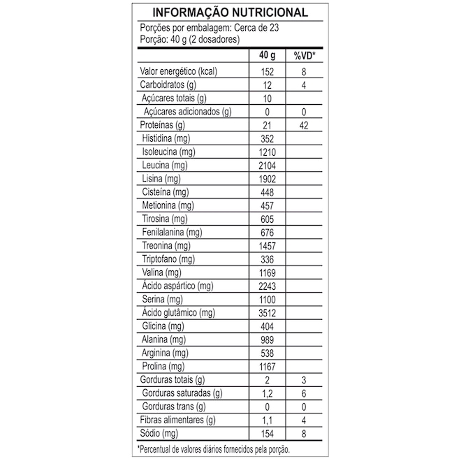 Tipo de Suplemento Proteína Sabor Chocolate Contém Glúten Não Contém Lactose Sim Sugestão de Consumo Pós-Treino Validade Vide Rótulo SAC do Fornecedor INTEGRALMÉDICA: (11) 3003-7887 ou sac@integralmedica.com.br Indicado Ganho de Força Cuidados de Conservação Manter o produto bem fechado.