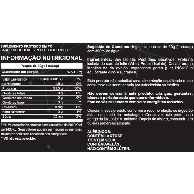 Soy Isolate, Proteína Isolada do soro do leite (Whey Protein Isolate), (Blend Flavours: Peptídeos Bioativos), aroma idêntico ao natural, espessante Goma guar INS142, edulcorante sucralose e xilitol.