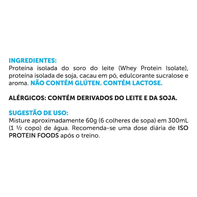 Ingredientes: Proteína isolada do soro do leite (Whey Protein Isolate), proteína isolada de soja, edulcorante sucralose e aroma..