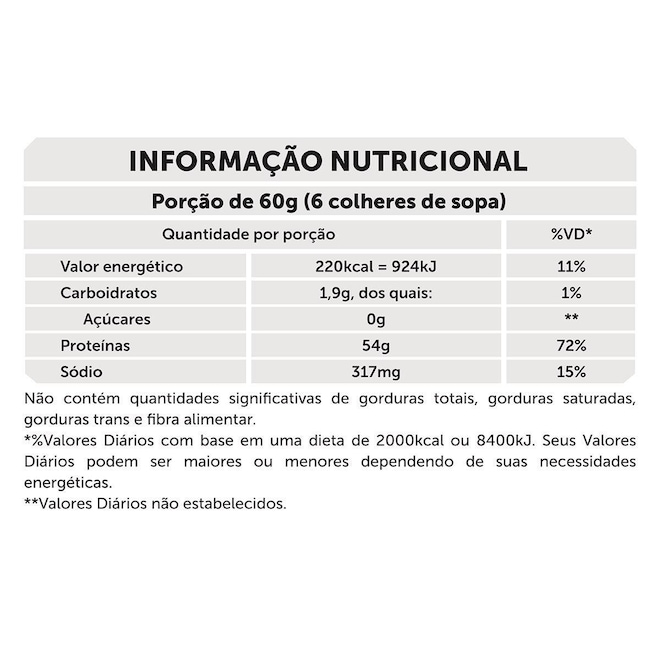 Ingredientes: Proteína isolada do soro do leite (Whey Protein Isolate), proteína isolada de soja, edulcorante sucralose e aroma..