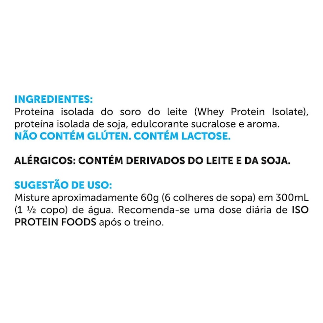 Ingredientes: Proteína isolada do soro do leite (Whey Protein Isolate), proteína isolada de soja, edulcorante sucralose e aroma..