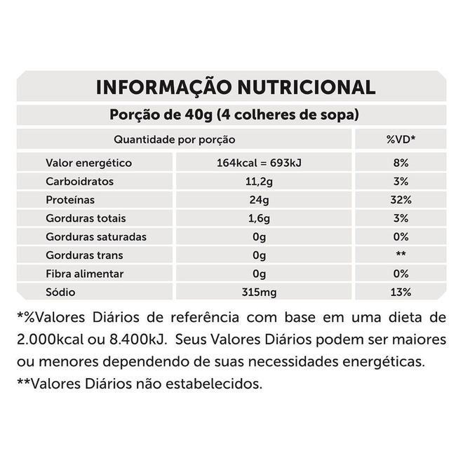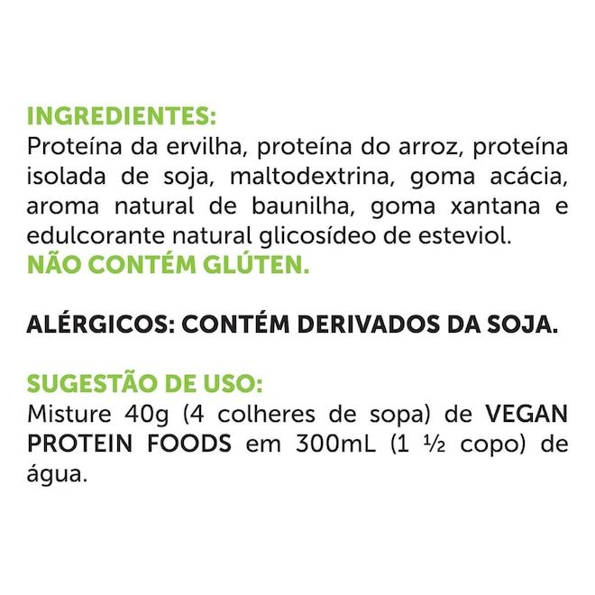 Ingredientes: Proteína da ervilha, proteína do arroz, proteína isolada de soja, maltodextrina, goma acácia, aroma natural, goma xantana e edulcorante natural glicosídeo de esteviol..