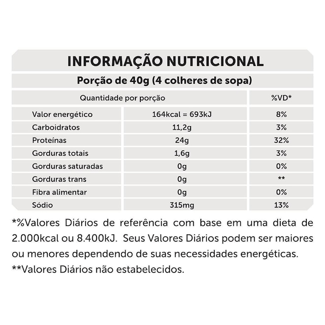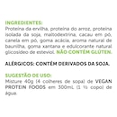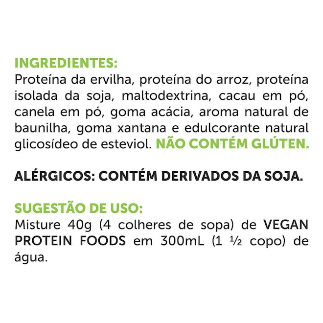 Ingredientes: Proteína da ervilha, proteína do arroz, proteína isolada de soja, maltodextrina, goma acácia, aroma natural, goma xantana e edulcorante natural glicosídeo de esteviol..